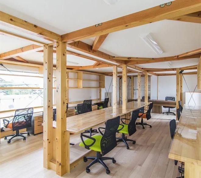 这所Piece Note的办公建筑中,内部纵横交错的木质框架连接了书桌、书架和门框,通过元素延伸整合了建筑中的家具。此时,木框架不再仅仅作为结构稳定性的功能——那只是它的“假动作”,实际上是在稳定的同时起到装饰效果。