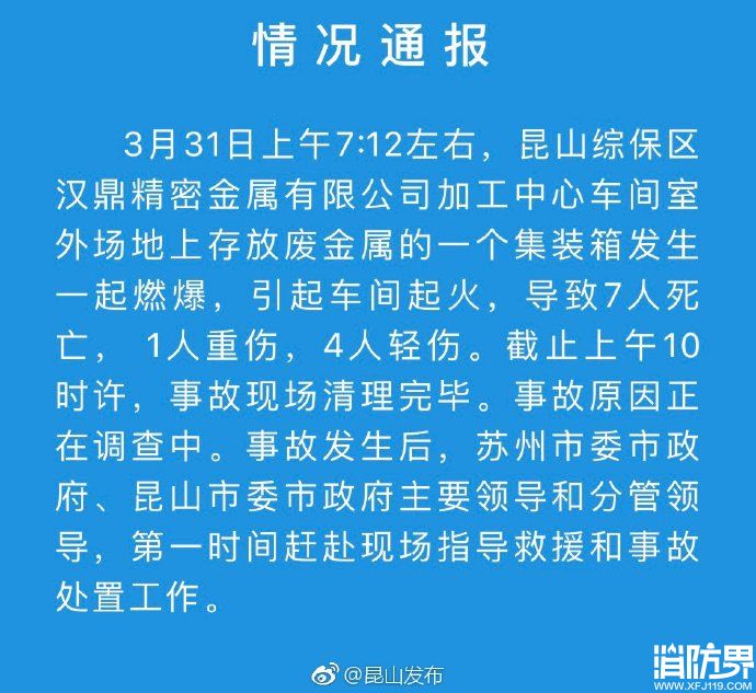人民网北京3月31日电 据江苏省昆山市政府新闻办公室官方微博消息,3月31日上午7:12左右,昆山综保区汉鼎精密金属有限公司加工中心车间室外场地上存放废金属的一个集装箱发生一起燃爆,引起车间起火,导致7人死亡, 1人重伤,4人轻伤。截止上午10时许,事故现场清理完毕。事故原因正在调查中。事故发生后,苏州市委市政府、凯发K8官方手机版昆山市委市政府主要领导和分管领导,第一时间赶赴现场指导救援和事故处置工作。