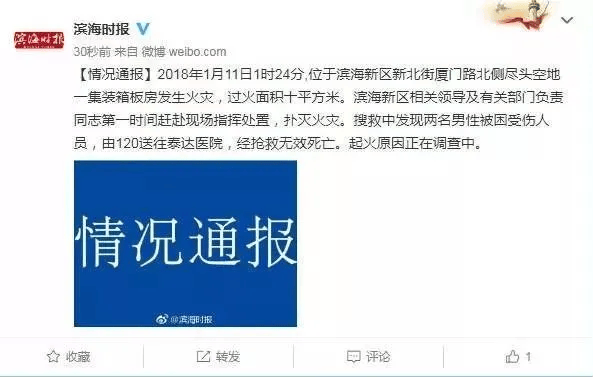 2018年1月11日,位于天津滨海新区新北街厦门路北侧尽头空地一集装箱活动房发生火灾,过火面积10平方米。滨海新区相关领导及有关部门负责同志第一时间赶赴现场指挥处置,凯发k8国际登录厅扑灭火灾。搜救中发现两名男性被困受伤人员,由120送往泰达医院,经抢救无效死亡。