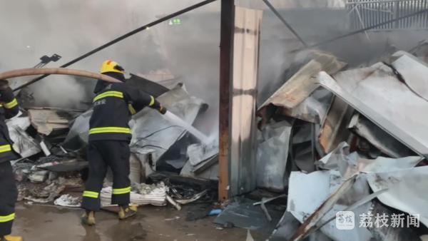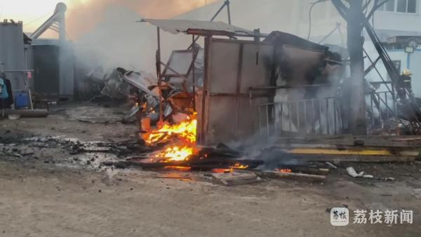 画面中可以看到,住人集装箱燃起火苗,不断有火光冒出,消防员到场后迅速出枪对火势进行控制,明火浇灭后随后对起火位置进行勘察,最后火情得到处置。