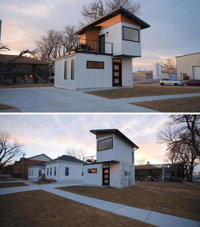 房屋采用的是传统的倾斜屋顶设计,并在顶部安装了太阳能板。集装外部做了防腐处理,喷涂了白色的隔热耐腐蚀涂料,并搭配木质和黑色铁艺框架构成,给人一种现代而温馨的感觉视觉感。
