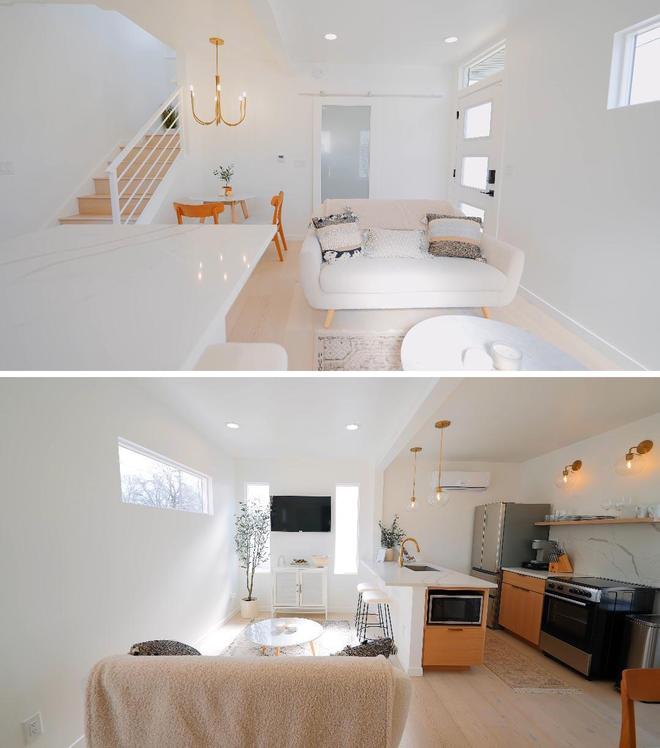 走进室内就给人眼前一亮,室内装修得简洁明亮。内部空间虽然小,但是该有的功能区域都具备了,包括了明亮的开放式客厅、精致简约的用餐区,以及功能齐全的厨房区。客厅上摆放有一张简约的双人沙发,一张地毯、一张咖啡桌,墙壁上也安装了一台智能电视。麻雀虽小五脏俱全说的就是它吧。