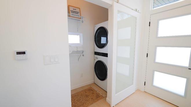 餐座椅被安排在了楼梯的一个转角区域,因为餐厅的主要用途还是提供用餐的场所,因此空间不比太大同时可以容纳两个人用餐就行。在楼梯侧边的拉门内隐藏了洗衣机和烘干机在内。