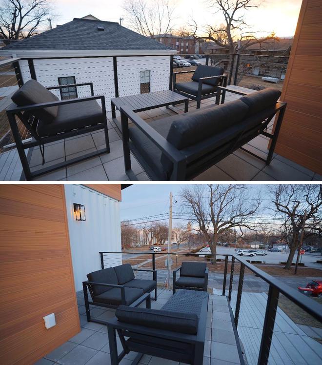 没有想到的是这套集装箱小别墅竟然还能设计出一个露台,没错!推开卧室的一扇门就可以来到这个屋顶的露天阳台了,这里摆放了户外专用的沙发和茶几,给我们提供了一个休闲和娱乐的多功能阳台。约上几个好友一同来露台上喝茶聊天,看看远处的风景,真的是小成本地度过了轻松惬意的周末时光。