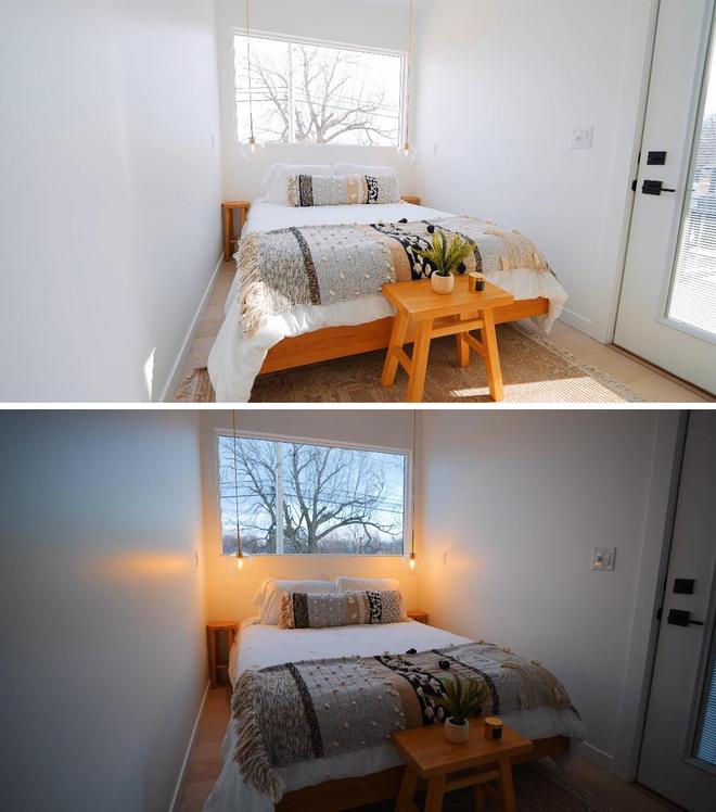 通过白色扶手的木楼梯,通向了私人卧室和卫生间的区域。一个超大的落地窗可以看到窗外的美景,同时它的高度也保证了卧室内的隐私性。同样卧室内的并没有太多复杂的设计,凯发app手机版下载一张床几乎占据了大半个空间,所以太多的设计反而是一种鸡肋。