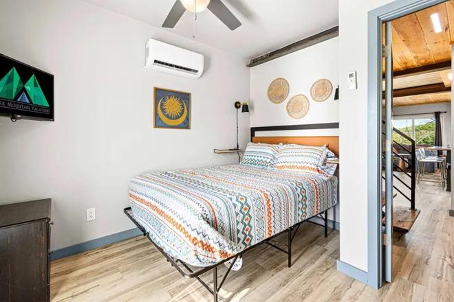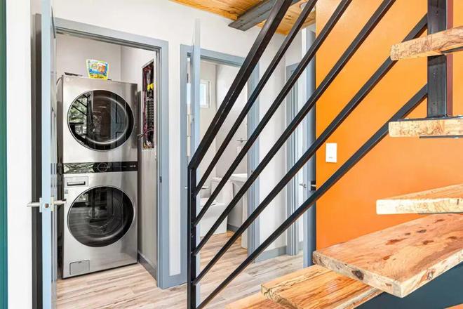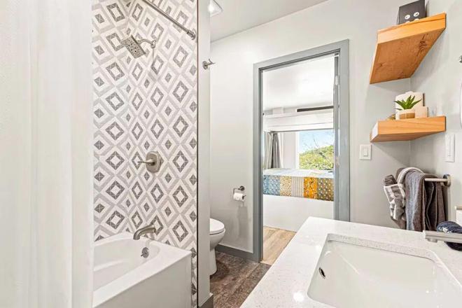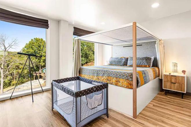 悬浮于二层的睡眠舱以黑色金属框架包裹,顶面可开合的玻璃穹顶让银河触手可及。床头望远镜与天文软件构成星空导航系统,配合木质百叶窗的过滤光线,营造出既开放又私密的观星体验。独立卫浴配备的瓷砖淋浴间,以几何图案瓷砖与嵌入式音响系统,将日常洗漱升华为沉浸式SPA。