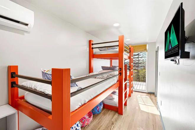 专为孩童设计的双层床区域,橙色钢构楼梯与网状防护栏构成空中走廊。每层床铺均配备独立阅读灯与储物格,落地窗外的螺旋楼梯成为连接屋顶的秘密通道,让睡眠空间化作垂直探险基地。