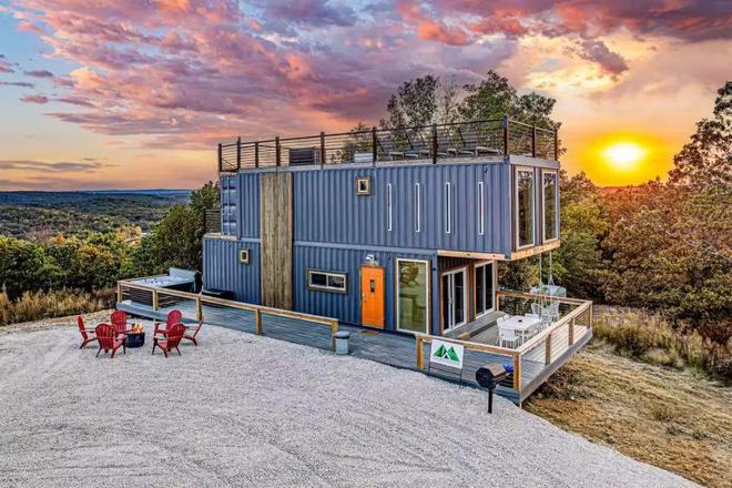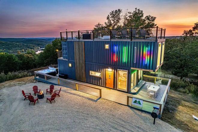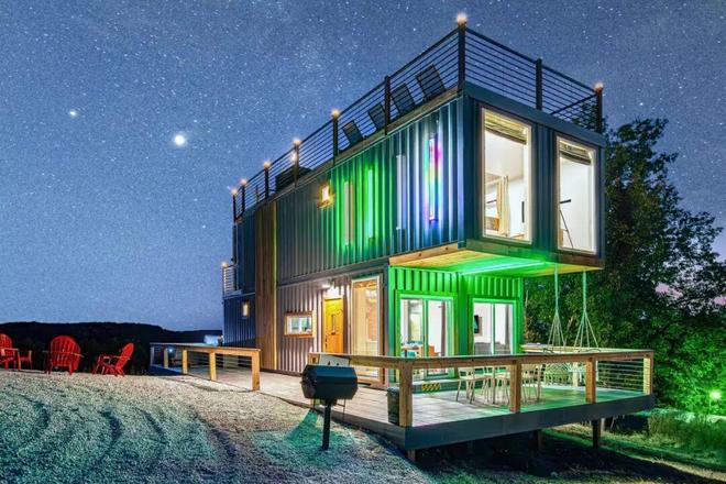 全屋采用地暖系统与智能照明,卫生间镜柜内置除雾功能与蓝牙音箱,连毛巾架都经过人体工学弧度设计。户外火坑区配备可旋转烤架,露台座椅采用再生塑料与软木的复合材质,既环保又舒适。当夕阳将集装箱外墙染成蜜色,绳灯渐次亮起,整个建筑便化身为漂浮在山巅的发光灯笼。