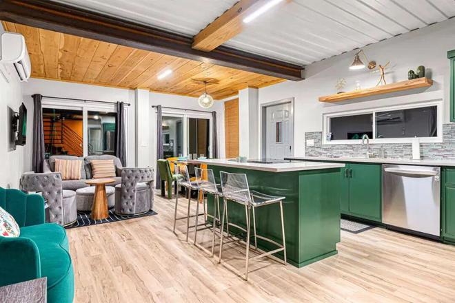 开放式起居空间以270°全景落地窗为画框,将湖光山色引入室内。厨房岛台采用再生钢材与绿色橱柜的碰撞设计,搭配马赛克瓷砖背景墙,形成粗犷与精致的对话。螺旋楼梯如DNA螺旋般盘旋而上,金属扶手与木质踏步的材质转换,暗喻着从大地到天空的升华。
